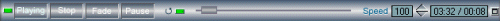 Play Bar The Play Bar ( above ) is one of two players - see Transamp. The Play Bar will play all songs in the song queue in sequence. Selecting 'Loop' will return the song queue to the start after the last song. From the main menu you can select VU meter ( if supported by the sound card ) or position meter. Click on the position meter to quickly jump to different parts of the song. The 'Speed' control will increase or decrease speed and pitch ( musicians - use it to help practice those rifs! ). Click on the right box to toggle between Play Bar and full screen. |