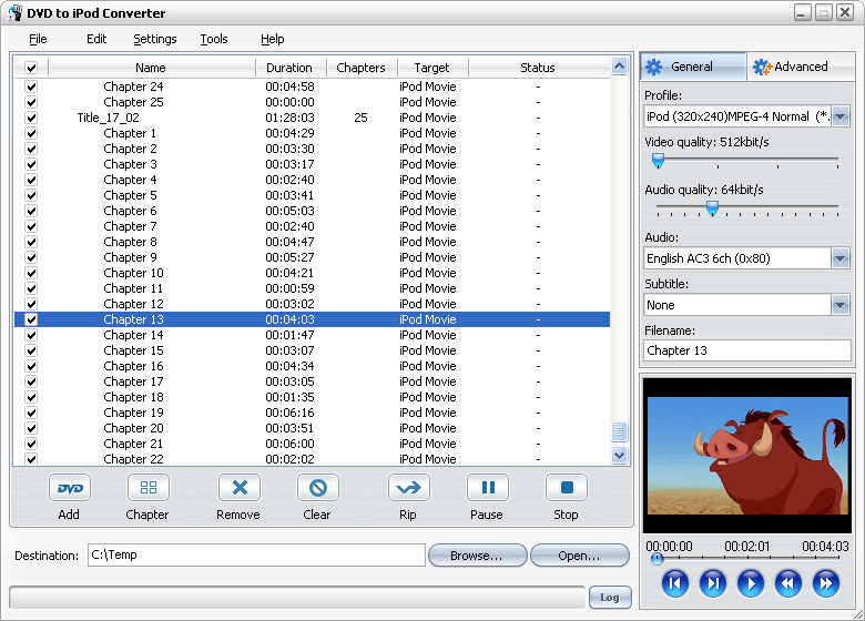 conversion from DVD into iPod video MP4/MPEG-4 format applied in Video iPod, wide