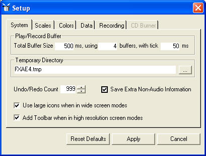 The system tab allows you to set the buffer size, buffer count, tick rate, temporary folder, undo/redo count and the option of saving or not saving extra data with the sound file.