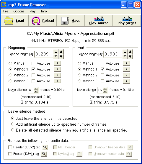 or multiple loaded or saved files. Note that mp3 Frame Remover doesn't play the