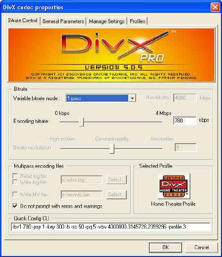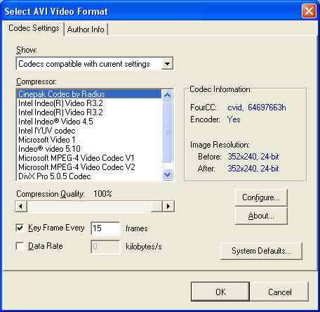 The AVI codec is responsible for the size and quality of your finished movie. Some codecs have additional properties that can be set using the Configure button as shown above. The additional properties can vary dramatically in appearance and function as can the results.