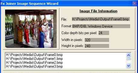 | Make one big movie from several small clips and/or still images. Trim or clip sections from larger movies. | | Creating a Movie From a Still Image or Image Sequence and an Audio File You can create a movie from a single still image or from a numeric sequence of still images. Fx Joiner and Splitter will detect and load image sequences if the first or last character in the file name are numerical and there is at least one more files with the same name and an incremented number. In other words, frame1.bmp will be detected as a sequence so long as there is a frame2.bmp. Detection stops when the next number in the sequence doesn't exist. When an image sequence is detected the wizard will load and display a list of all the files in the sequence. The duration of the new movie will be based upon the television standard that you select, 29 FPS for NTSC and 25 FPS for PAL.
