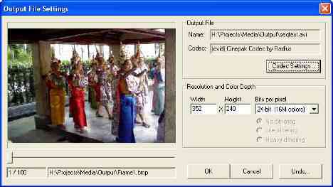 Output file properties can be modified to specify the compression codec, the width and height and, in the case of AVI formats, the color depth.