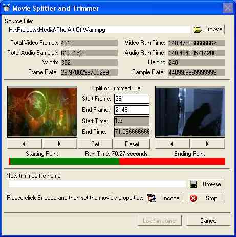 You can select your start and ending frames using the Starting Point and Ending Point Up/Down buttons. Single click for small moves, click and hold the mouse button to scroll up or down.