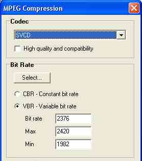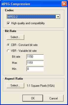 Likewise if you change the MPEG Codec type from the drop down list the Bit Rate will be changed to match but the resolution ill be left as it was and must be changed manually to match the correct standard.