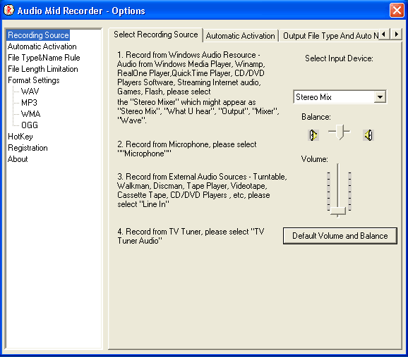 Winamp, RealOne Player,QuickTime Player, WinDVD Players, Streaming Internet audio, Games, Flash, please select the "Stereo Mixer" which might appear as "Stereo Mix", "What U hear", "Output", "Mixer", "Wave". - 2. Record Audio from Microphone, please select "Microphone"