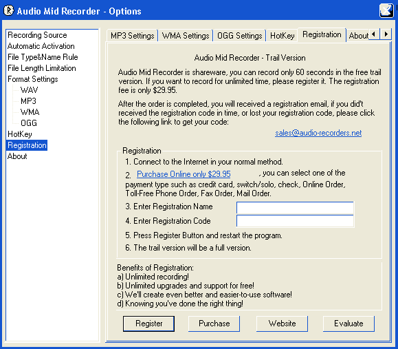 Audio Mid Recorder is shareware, you can record only 60 seconds in the free trail version. If you want to record for unlimited time, please register it. The registration fee is only $29.95.