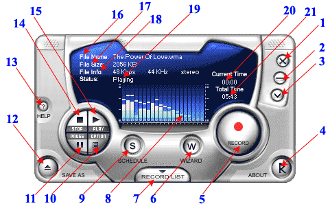 | | | | Audio Mid Recorder | Editor's Choice |  | | | | | | | | Main Window Description | | 1. Quit | Quit the program. | | 2. Minmaize | Minimize the Window. | | 3. SystemTray | System Tray Mode. | | 4. About | About & CopyRight Dialog. | | 5. Record | Start recording. Remember to select a file name and the appropriate properties before recording. | | 6. Wizard | Show Wizard Dialog, set appropriate properties for recording. | | 7. Show Recorderlist | Show and Hide Reocrdlist dialog. | | 8. Oscilloscope | Real-time oscilloscope, it is is intended for visual representation of audio data in the process of playback or record. | | 9. Schedule | Show schedule dialog, Create a recording schedule. | | 10. Option | Show Option Dialog, set properties for recording. | | 11. Pause | Pause recording or playing, click again, restart recording or playing. | | 12. Save As | Create a new file or open an existing file for recording and playing. | | 13. Help | Show the Help file. | | 14. Stop | Stop recording or playing. | | 15. Play | Play a file listing in the recording list. | | 16. File Name | Show The File Name of the selecting file in the recorder list. | | 17. File Size | Show The File Size of the selecting file in the recorder list. | | 18. File Information | Show The File Bitrate , Frequence, Channel of the selecting file in the recorder list. | | 19. Recorder Status | Show the Recorder Status. - Ready --- The recorder is idle.