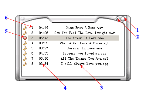 | | | | | | | | | | Recorderl List Window Description | | 1. SystemTray | System Tray Mode. | | 2. Minmaize | Minimize the Window. | | 3. File Name | Show The File Name of the selecting file in the recorder list. | | 4. Total Time | Show current position for playing file. | | 5. File Status | Show the File Status: 1. Ready 2. Play 3. Pause 4. Record 5. Stop | | 6. File Serial Number | Stop recording or playing |
