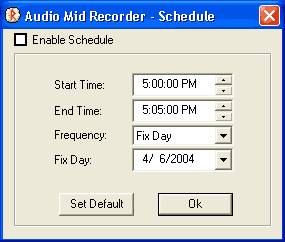 This window allows you to schedule a recording to be made automatically at a time you specify. Before you change the settings here, un-check the "Enable Schedule" box. When you are finished be sure to check the box to activate your schedule.