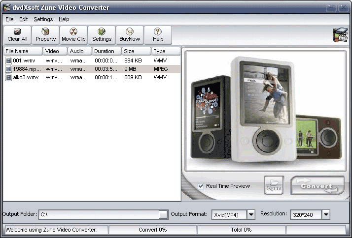 Zune video by three formats: WMV, MP4 of H.264 and MP4 of Xvid. It can convert